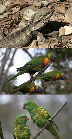 Schlangen, zig bunte Vogel- und Papageienarten, Wallabys,